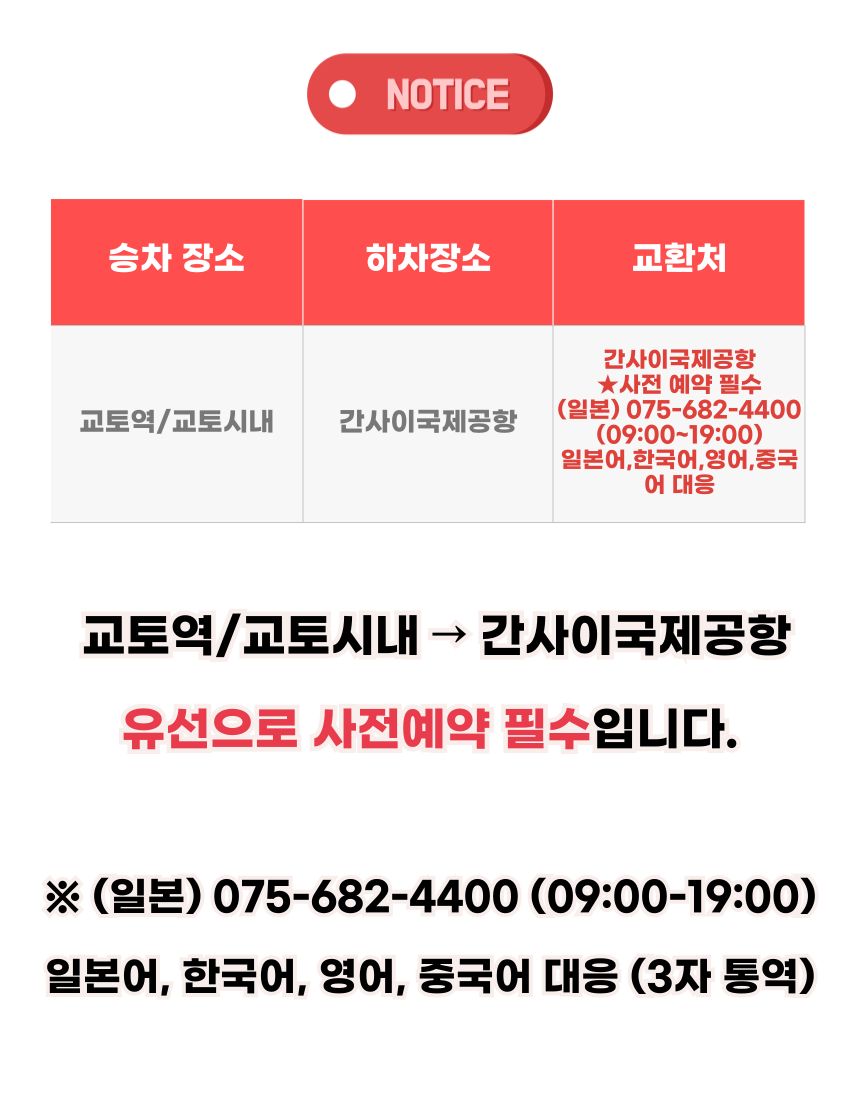 교토역 하치조구→간사이 공항 노선은 모두 사전 예약제로 진행되며, +81-75-682-4400(09:00-19:00)을 통해 사전 예약 바랍니다. (일본어, 영어 대응 및 통역 대응 가능)