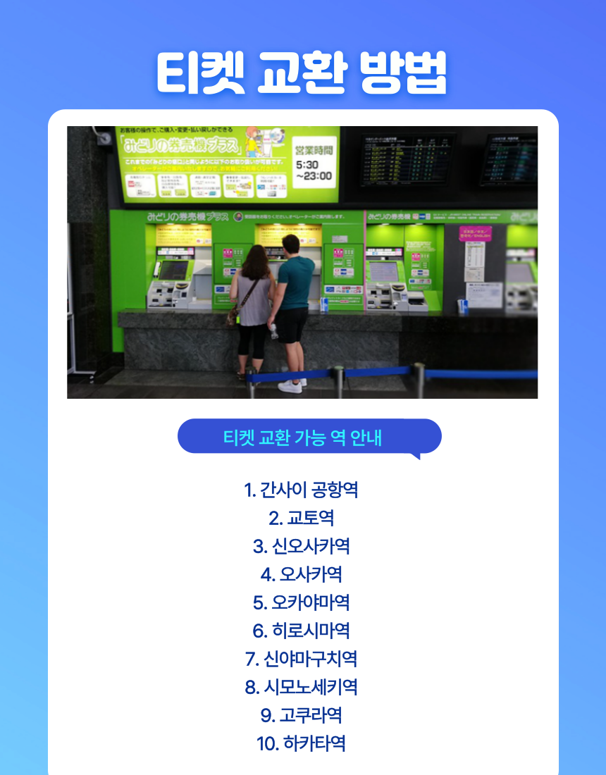 자동발권기에 결함이 있거나 또는 여권에 IC칩 부착이 없는 경우 지정된 역의 미도리노마도구치로 가서 실물티켓을 교환 하십시오.