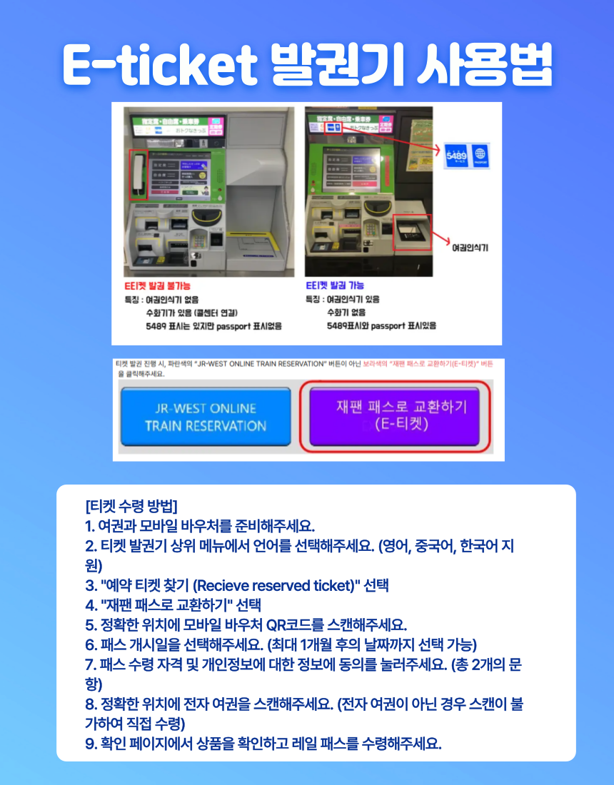 티켓 발권 진행 시, 파란색의 “JR-WEST ONLINE TRAIN RESERVATION” 버튼이 아닌 보라색의 “재팬 패스로 교환하기(E-티켓)” 버튼을 클릭해주세요.