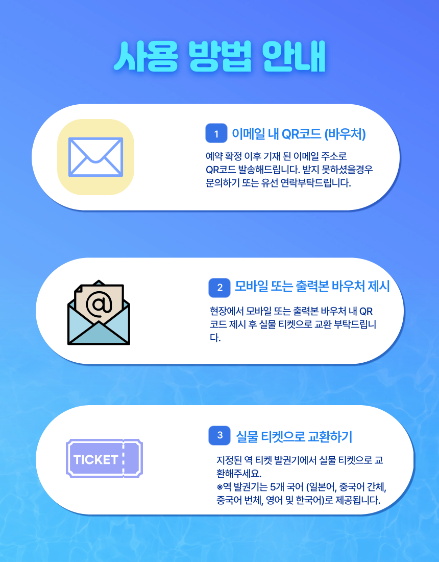 2장 이상 예약하시는 경우, 대표자의 정보를 중복 기입하는 것이 아닌 이용 예정자 전원의 정보를 기입해주세요. 그렇지 않은 경우 티켓은 발행되지 않습니다.
