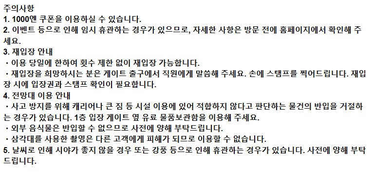 자세한 영업시간, 휴관일, 유효기간에 대한 정보는 공식 사이트와 각 시설의 홈페이지에서 방문 전 다음 링크를 참고해 주세요.