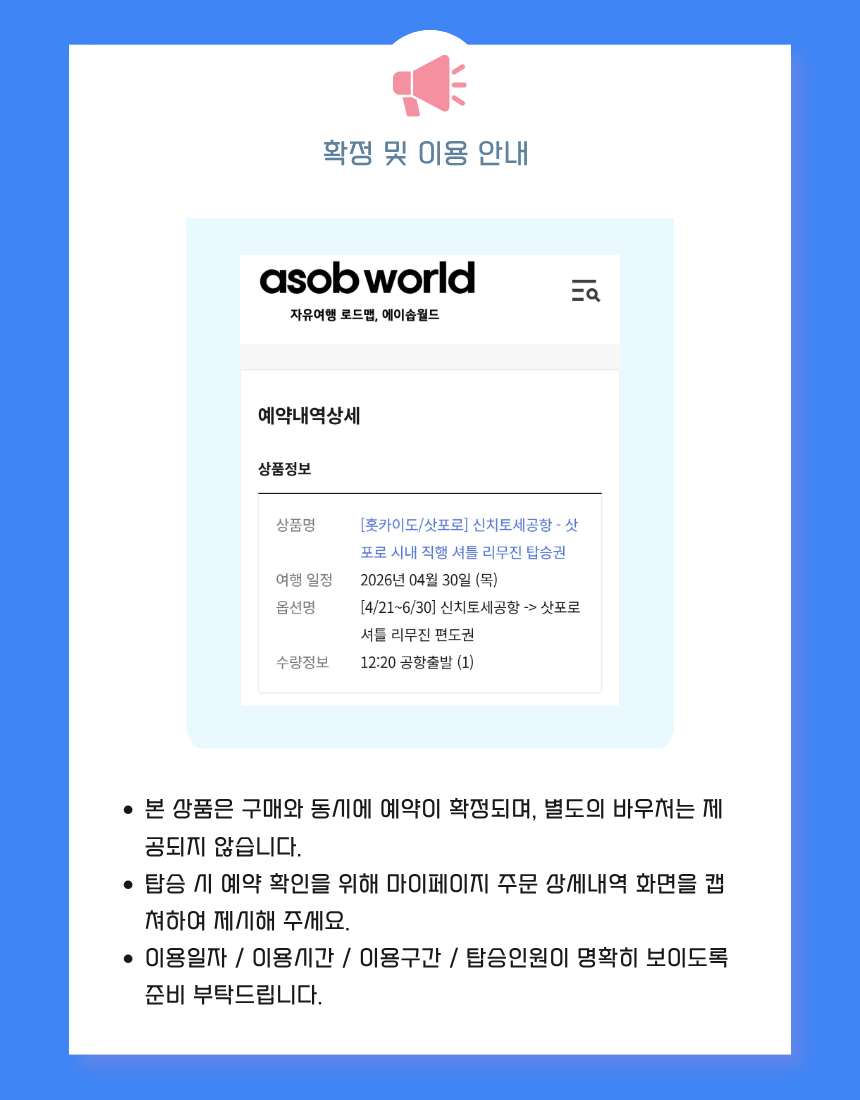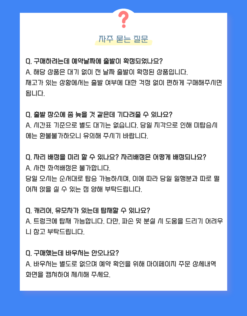 별도의 사전 좌석배정 없이, 모든 좌석은 당일 오신 순서대로 배정/탑승이오니 이 점 참고 부탁드립니다 (탑승 순서에 따라 일행분과 떨어져 앉을 실 수 있는 점 양해 부탁드립니다)