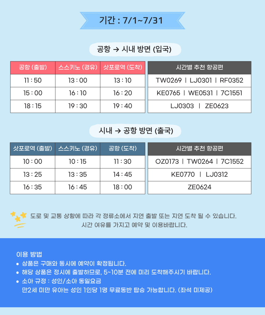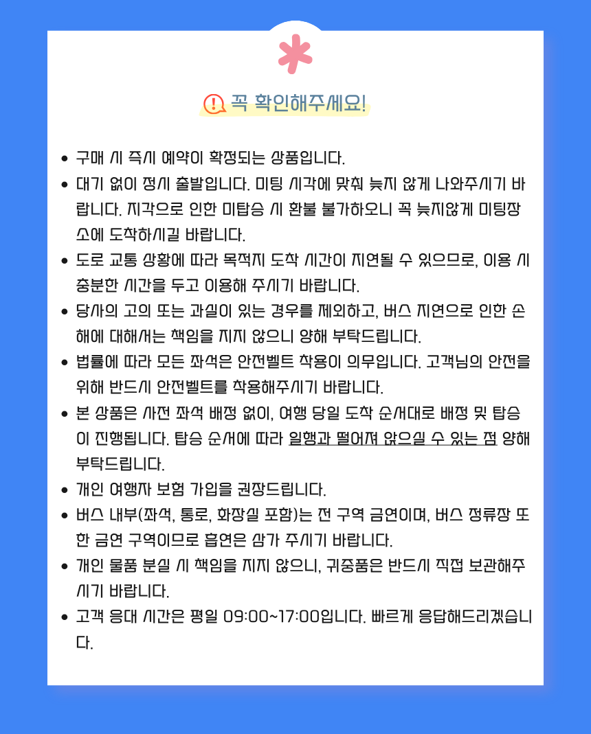 특별한 사유 없는 한 정시 출발입니다. 탑승 시각에 맞춰 늦지 않게 나와주시기 바랍니다. 지각으로 인한 미탑승 시 환불 불가하오니 이점 유의 바랍니다.