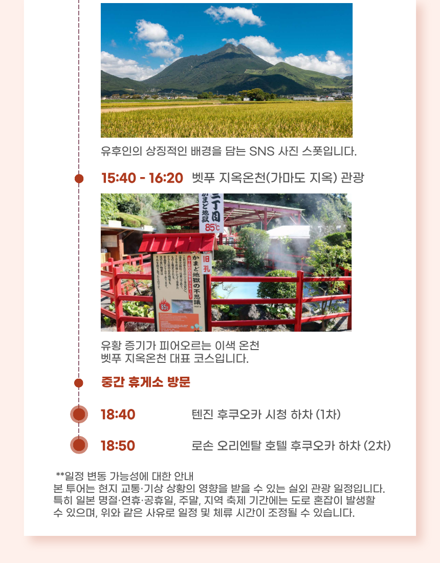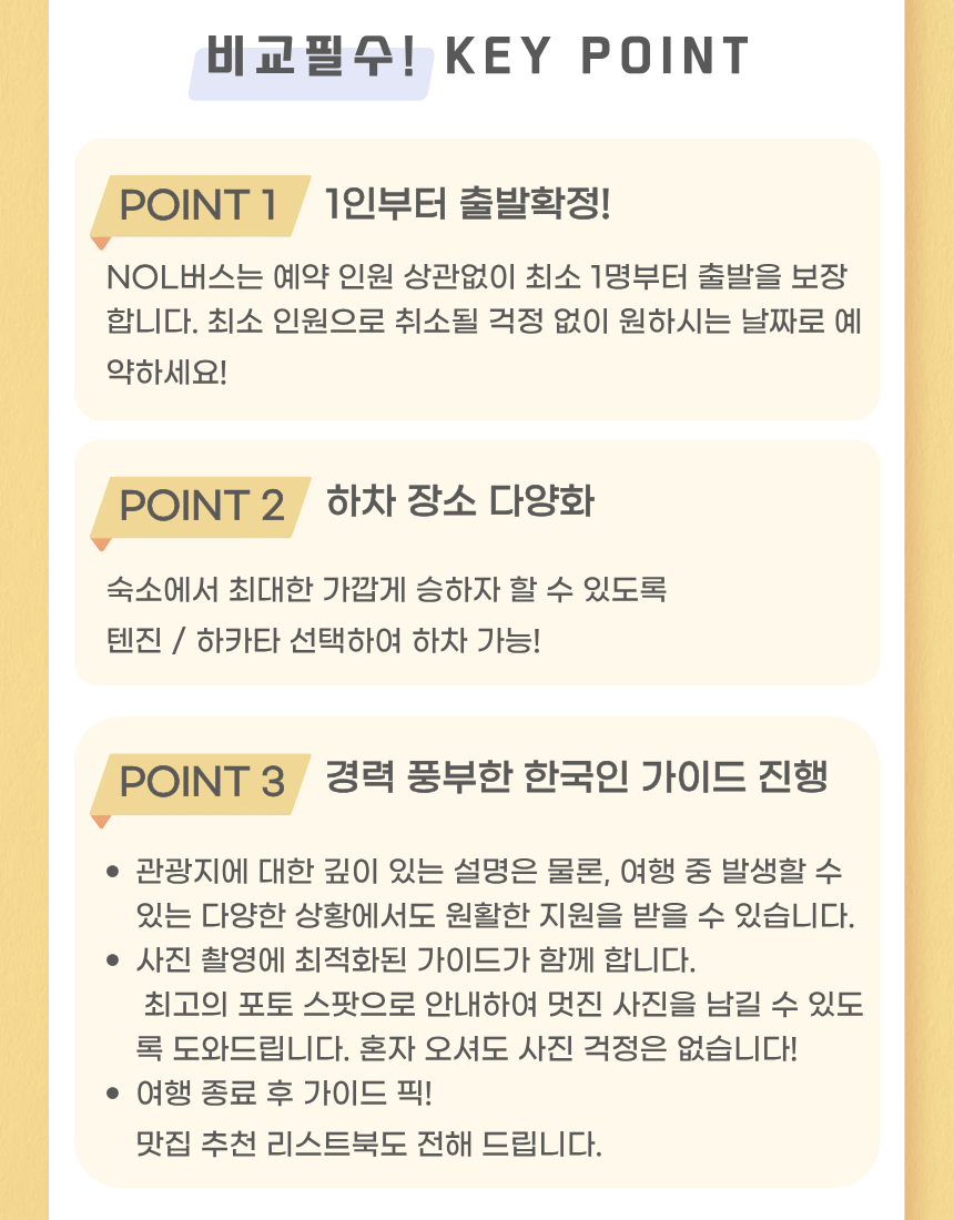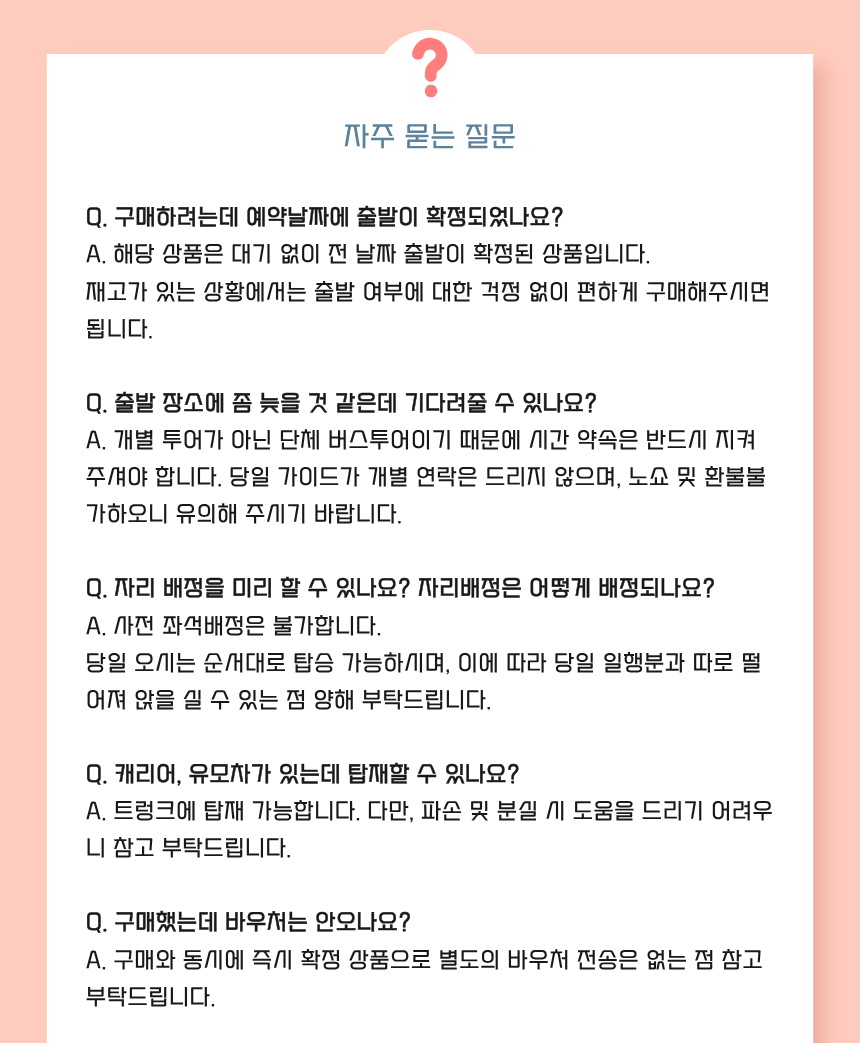본 투어는 명절·공휴일 및 당일 현지의 교통상황과 기상상황에 따라 일정 순서 및 체류 시간이 조정 될 수 있으며, 안전을 위한 변경은 환불 사유에 해당하지 않는 점 양해 부탁드립니다.