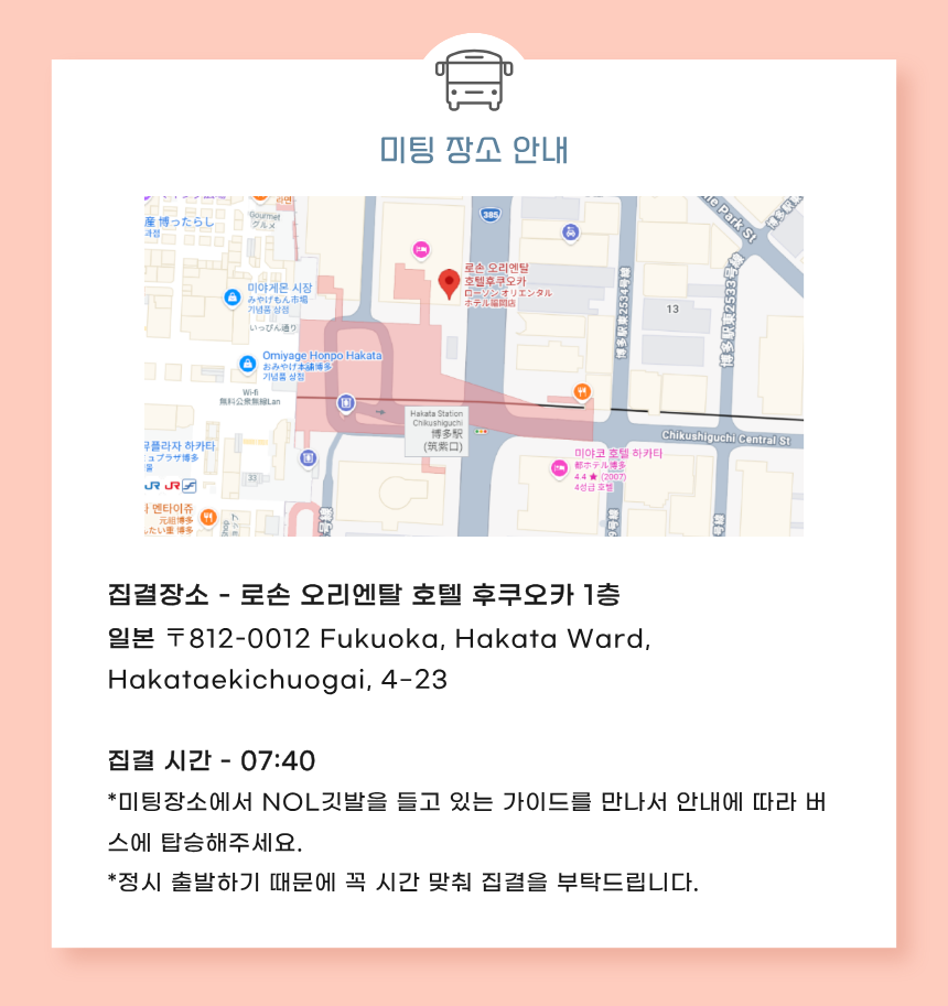 대기 없이 정시 출발입니다. 미팅 시각에 맞춰 늦지 않게 나와주시기 바랍니다. 지각으로 인한 미탑승 시 환불 불가하오니 꼭 늦지않게 미팅장소에 도착하시길 바랍니다.