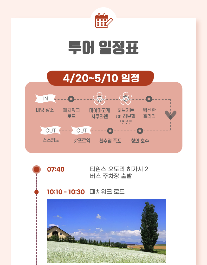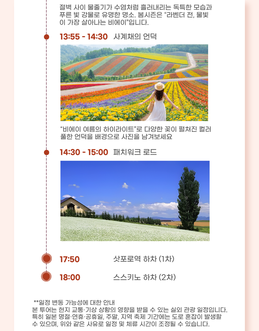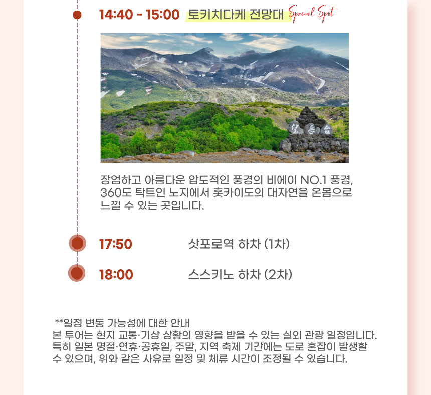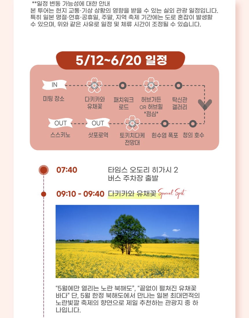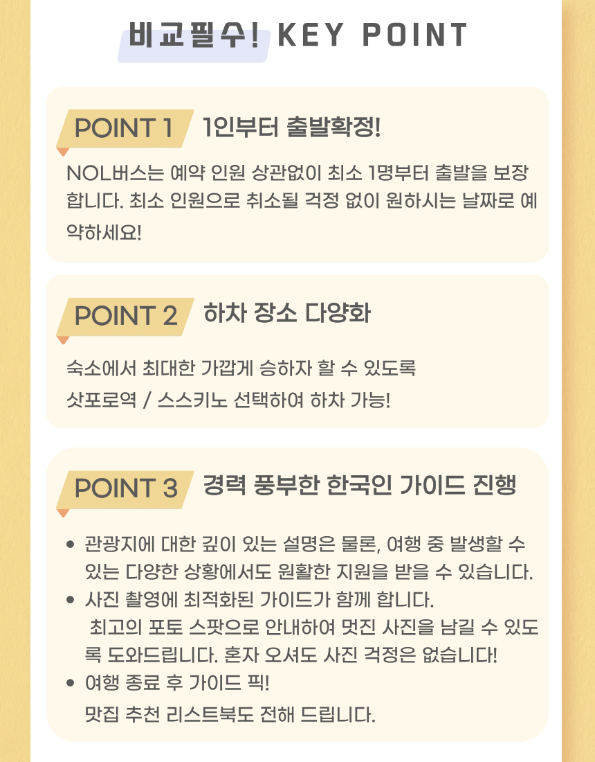 본 투어는 명절·공휴일 및 당일 현지의 교통상황과 기상상황에 따라 일정 순서 및 체류 시간이 조정 될 수 있으며, 안전을 위한 변경은 환불 사유에 해당하지 않는 점 양해 부탁드립니다.