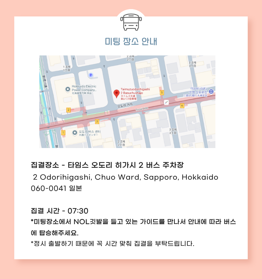 대기 없이 정시 출발입니다. 미팅 시각에 맞춰 늦지 않게 나와주시기 바랍니다. 지각으로 인한 미탑승 시 환불 불가하오니 꼭 늦지않게 미팅장소에 도착하시길 바랍니다.