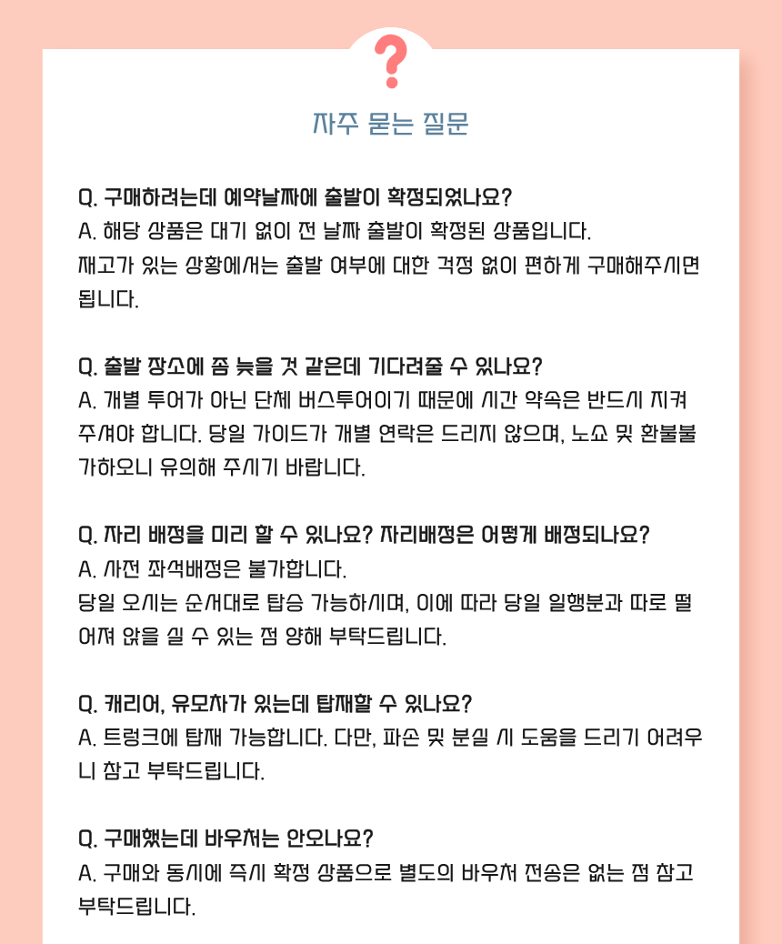 별도의 사전 좌석배정 없이, 모든 좌석은 여행 당일 오신 순서대로 배정/탑승이오니 이 점 참고 부탁드립니다 (탑승 순서에 따라 일행분과 떨어져 앉을 실 수 있는 점 양해 부탁드립니다)